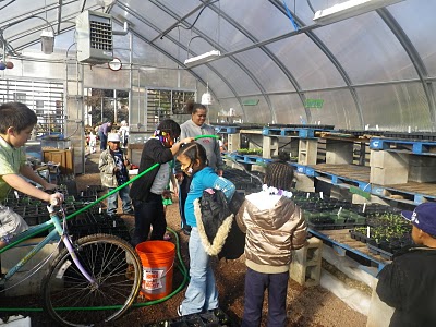 the tomato starts are about three inches tall, surrounded within a greenhouse that is expecting, reflecting and refracting the traveling light.